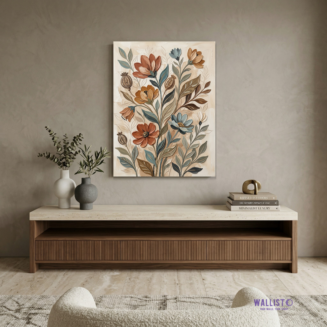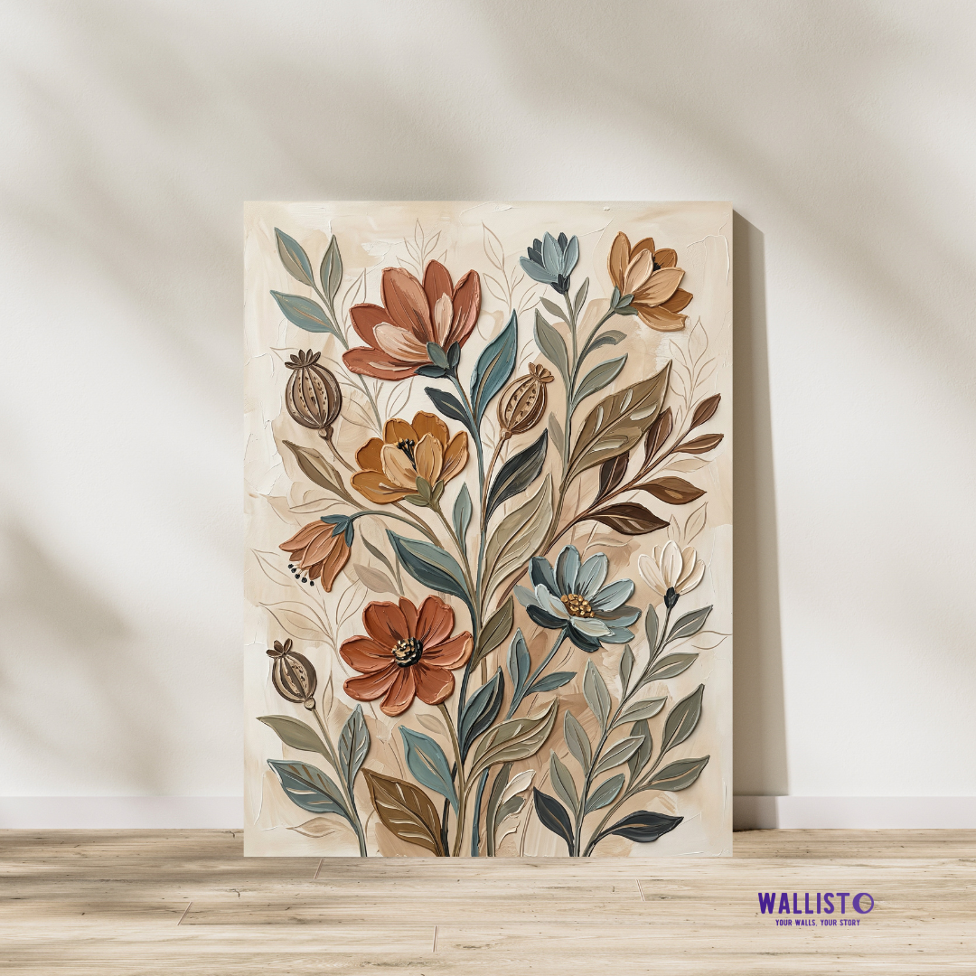 Artwork Story: This artwork feels rich, graceful, and full of quiet life, with layered florals that bring beauty without looking loud. Its soft beige base, muted teal leaves, terracotta petals, and warm ochre tones create a comforting palette that can make a room feel styled, inviting, and thoughtfully complete. It adds warmth to neutral spaces and gives elegant depth to corners that need charm and softness.