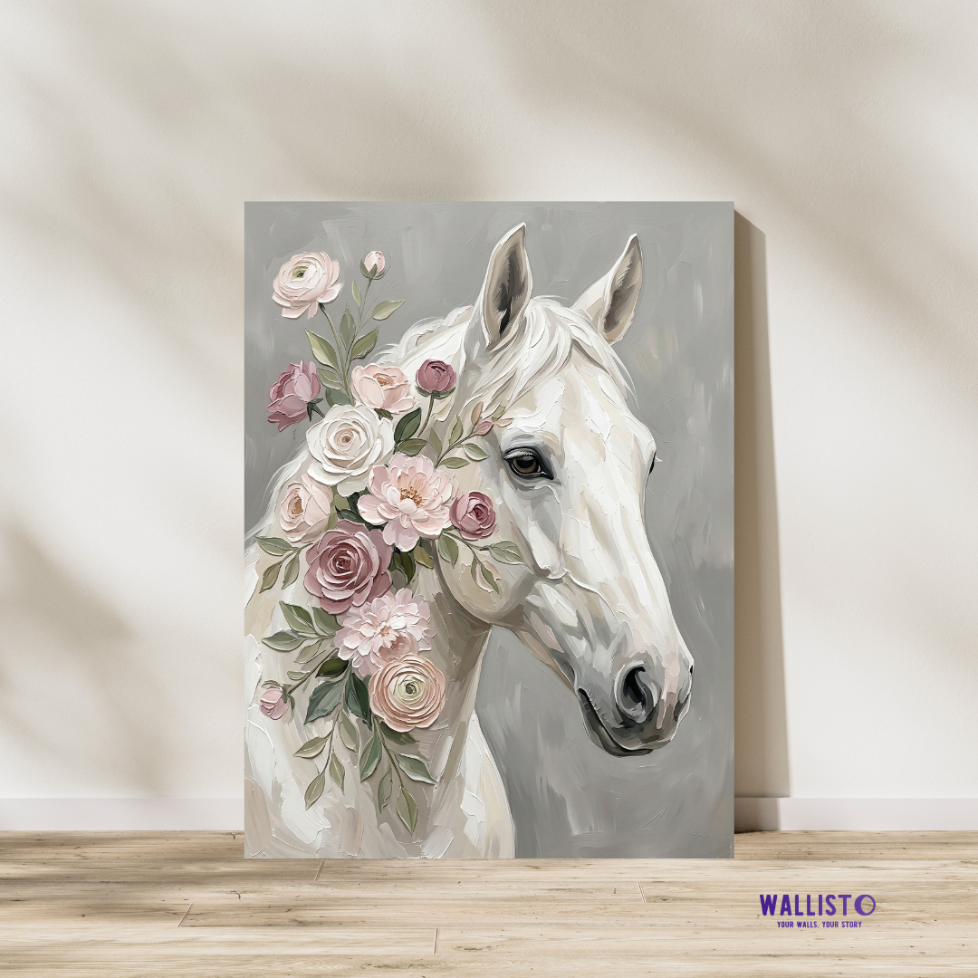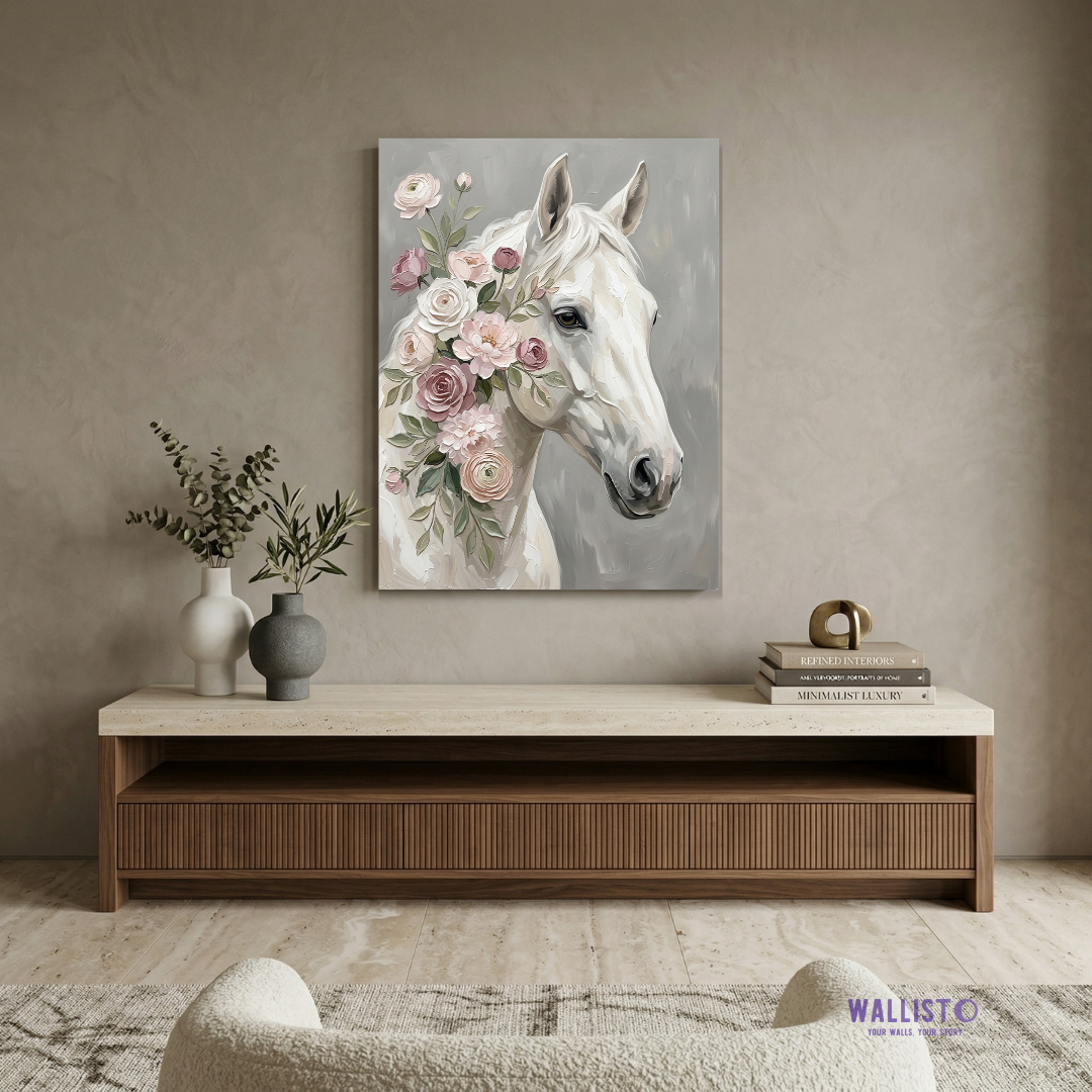 Artwork Story: This piece is elegant, soft, and full of noble beauty, with the horse carrying both strength and tenderness at the same time. The white form paired with dusty pink florals, sage leaves, and a soft grey background creates a romantic and calming palette that can make a room feel graceful, airy, and refined. It adds charm and luxury together, making the space feel more artistic and beautifully finished.