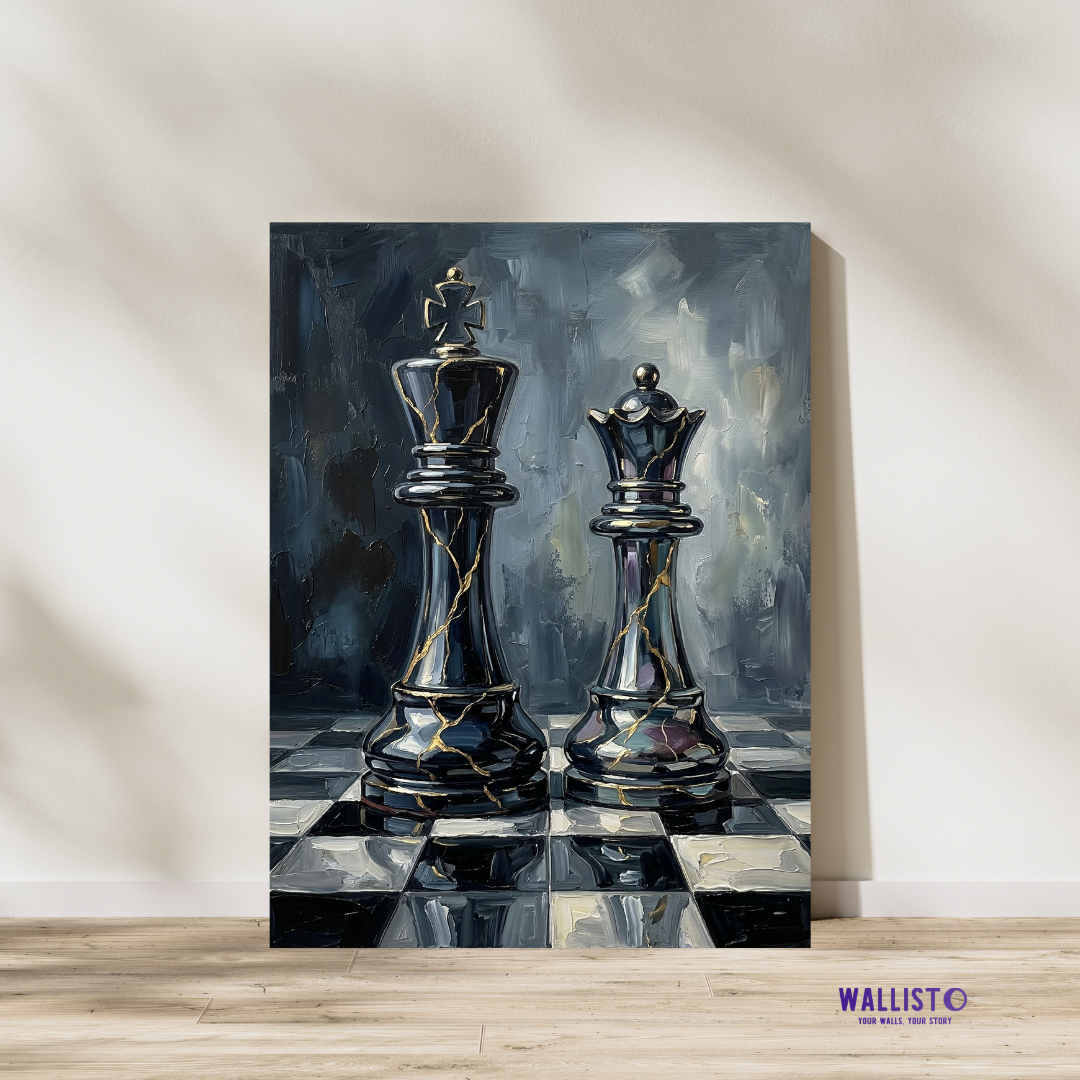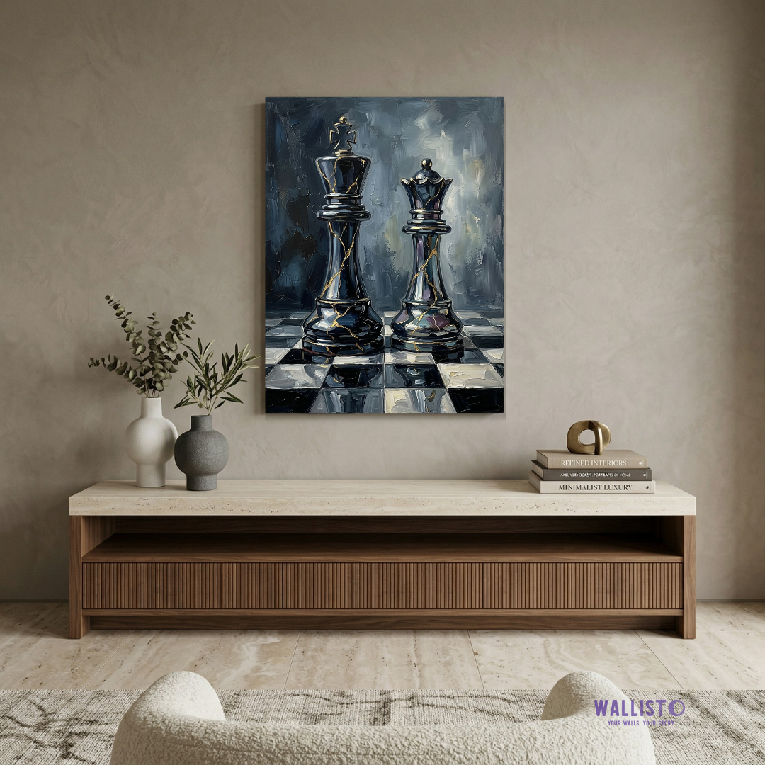 Artwork Story: This artwork is bold, intelligent, and symbolic, turning chess into a statement about strength, resilience, and quiet power. The glossy black pieces with fine golden repair lines create a dramatic contrast against the cool smoky blue background, giving the room depth, sophistication, and a strong premium edge. It is perfect for spaces that need confidence, character, and a more elevated masculine energy.
